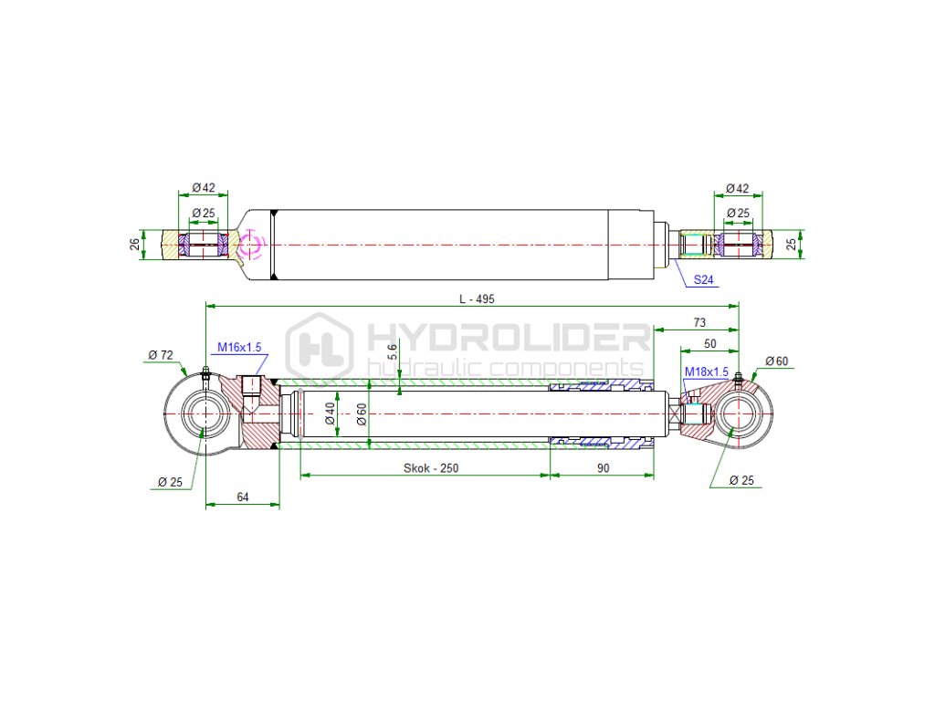 Jednoźinně plun§rově hydraulickě v lec pro agreg t d‚lka: 495mm zdvih: 250mm CJ2F-40/60/250
