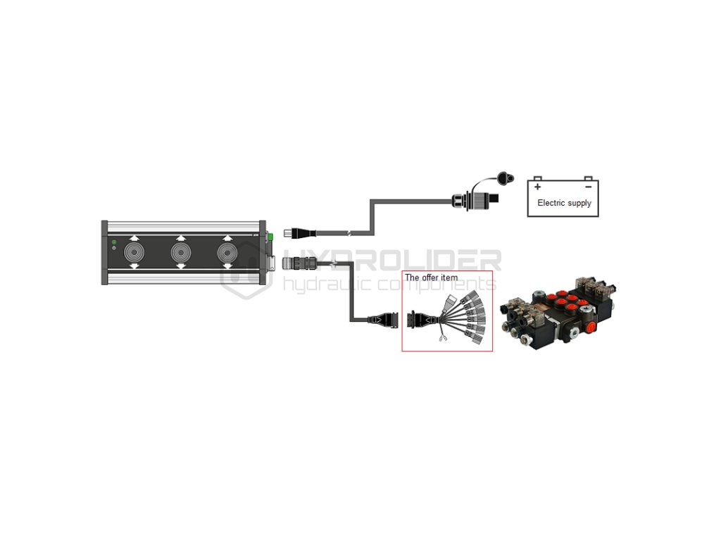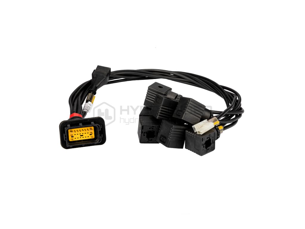 | Aplikace: | Svazek kabelů s elektrickými zástrčkami pro připojení k cívkám hydraulického rozvaděče a dalším zařízením jako jsou zvukové nebo světelné indikátory nebo jiné vypínače. Svazek spojuje mezikabel vycházející z ovládacího panelu s cívkami 3sekčního rozvaděče. Hodí se k panelu Salvarani BOX 3 3XJOY 3P v hliníkovém pouzdře se symbolem výrobce: 911329 a mezikabely CV91505 a CV91507. |