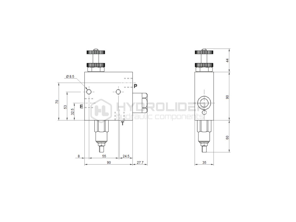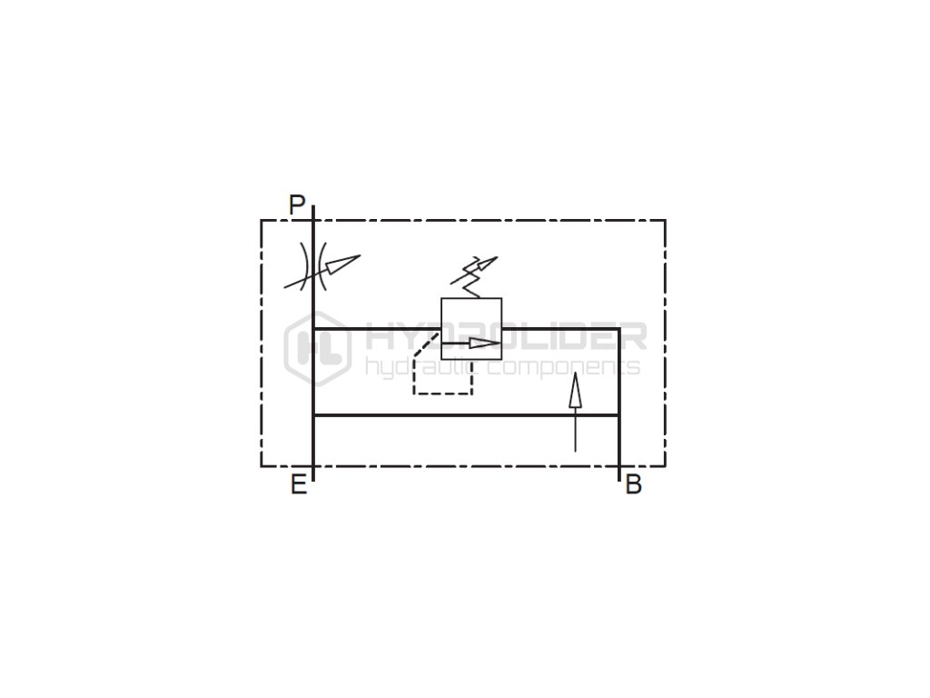 | Spojení: | Připojte E k přívodnímu vedení a P k přijímači nebo k hydraulickému vedení, kde je vyžadována regulace průtoku a tlaku. Připojte T k vratnému potrubí do nádrže. |